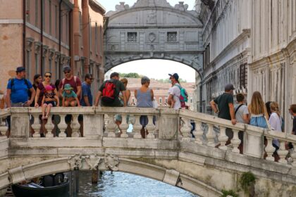 Tourists look at the Bridge of Sighs in Venice, Italy, on Aug.…
