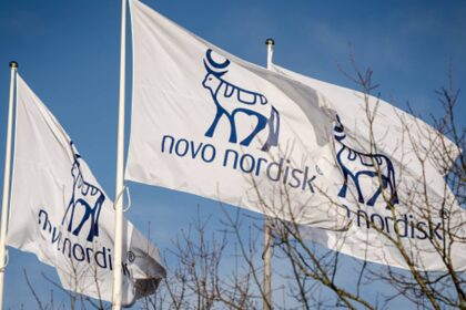 Flags with the logos of Danish drugmaker Novo Nordisk, maker of the…