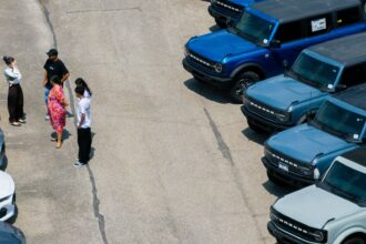 In an aerial view, Ford Broncos are seen for sale on a…